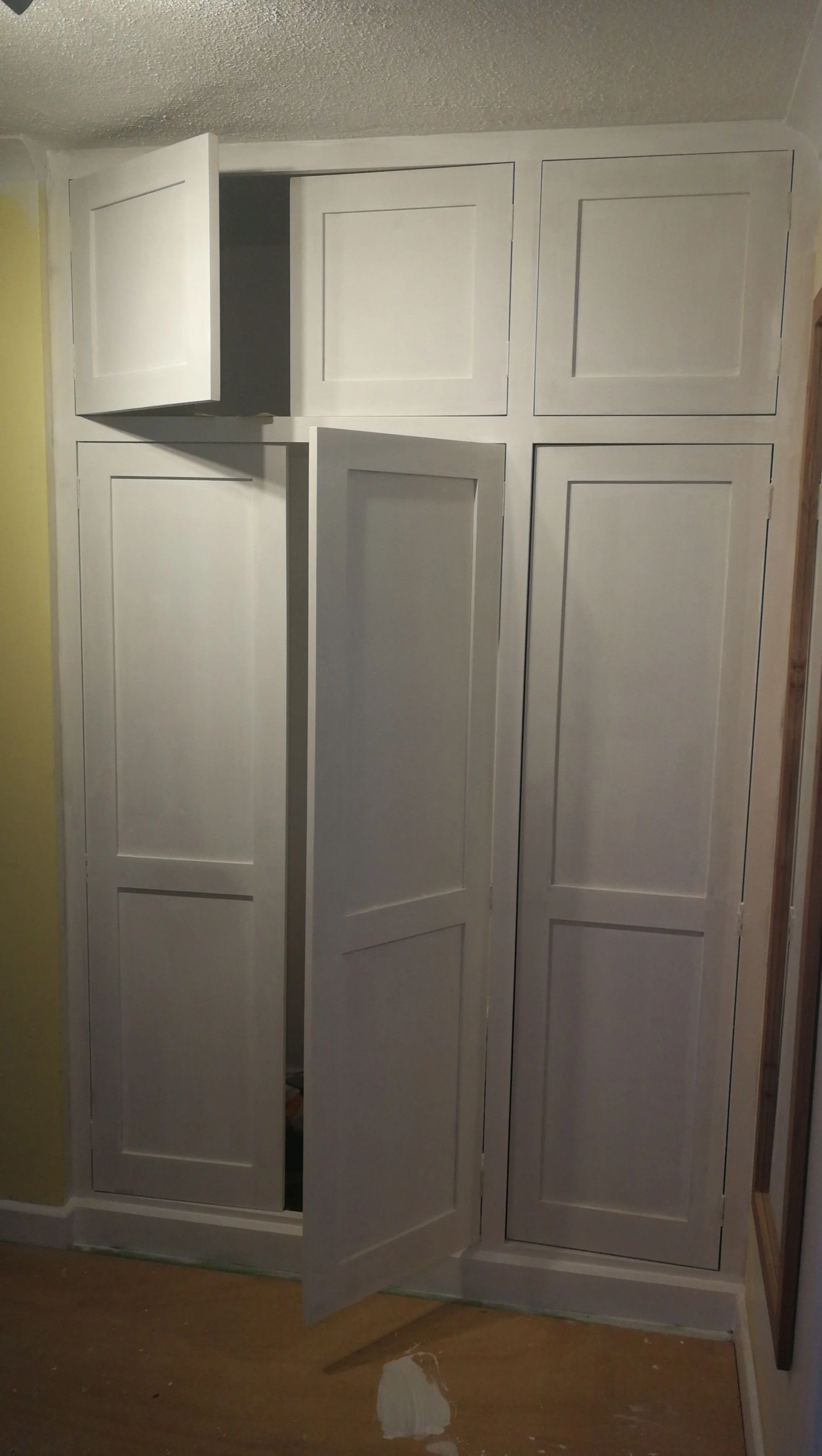 Phase One: The first phase featured a custom-built shaker-style unit with three wide doors and three top storage boxes. The double-door section was fitted with hanging rails for coats, while the right-hand unit housed storage for a vacuum cleaner and other essentials. The top boxes provided additional storage, making excellent use of vertical space.